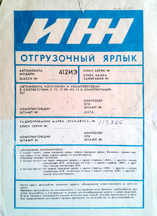 Отгрузочный ярлык автомобиля «Иж-412ИЭ «Москвич», 1978 г.